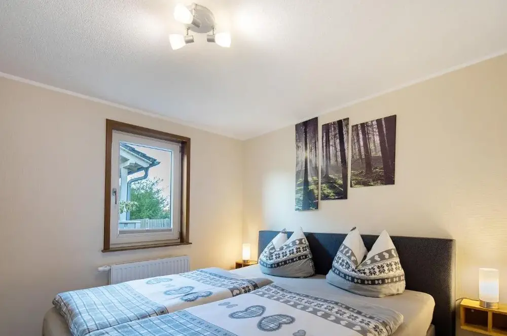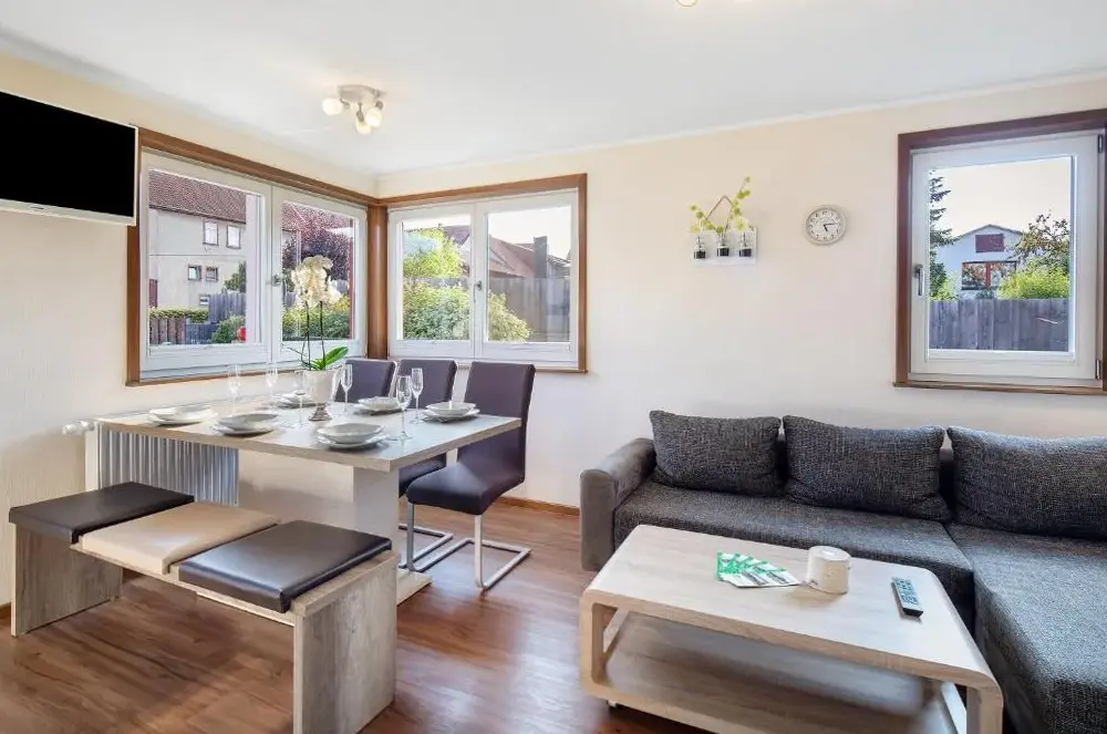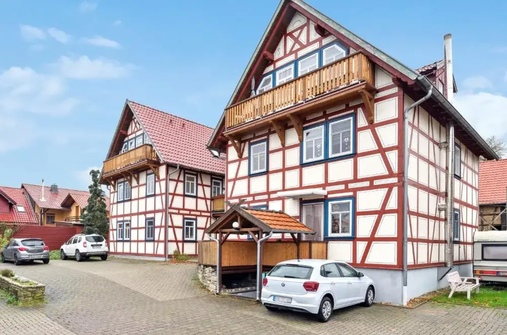 Mere information om Apartments am Hainich - 6 Personen, King-Size-Betten, Netflix, NationalparkFerienhäuser Hainichhöhe i Schloßgasse 76, 99820 Hörselberg-Hainich, Tyskland, er et feriehus med en have og gratis wifi. Ejendommen omfatter en gårdhave, privat badeværelse, køkken og udsigt over haven. Der er mulighed for fritid aktiviteter såsom udendørs ophold, legeplads og grilling. Feriehuset indeholder en kaffemaskine, køleskab og tv. Det ligger på ca.