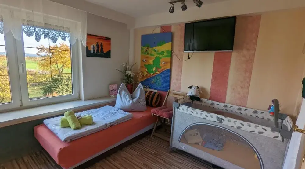 Weitere Informationen zu Pension DorfliebeDie Ferienwohnung Goldbacher Blick ist eine geräumige Unterkunft mit zwei Schlafzimmern und einem Wohnzimmer, ideal für Familien oder Paare. Sie bietet eine moderne Ausstattung inklusive vollständig eingerichteter Küche mit Waschmaschine sowie kostenlosem WLAN und Streaming-Diensten.
