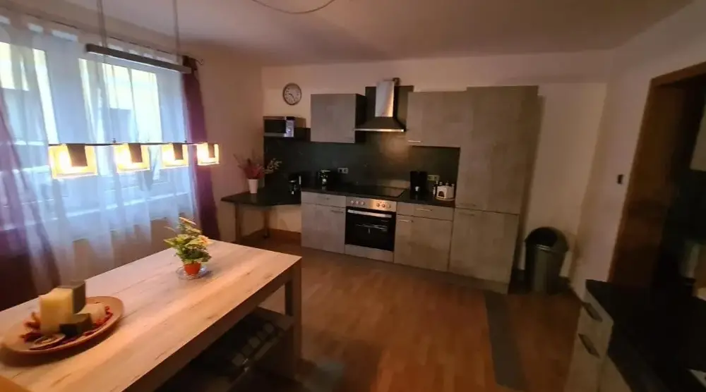 Weitere Informationen zu Be my Guest - Erfurt in der NaturDie Ferienwohnung Monteurzimmer 2 Haus Arnstadt befindet sich in Arnstadt und verfügt über zwei Schlafzimmer sowie eine gut ausgestattete Küche mit Kaffeemaschine, Kühlschrank, Mikrowelle, Ofen und Herd. Im Essbereich steht ein Tisch bereit, während ein Fernseher und ein elektrischer Wasserkocher zusätzliche Ausstattungsmerkmale darstellen.
