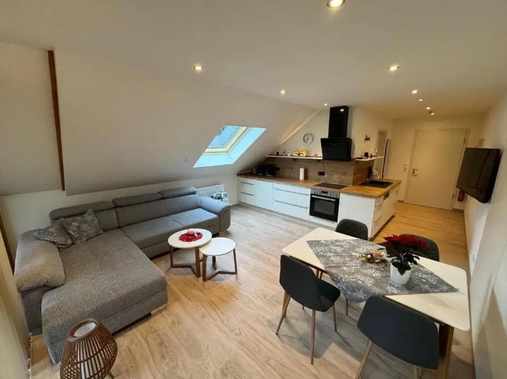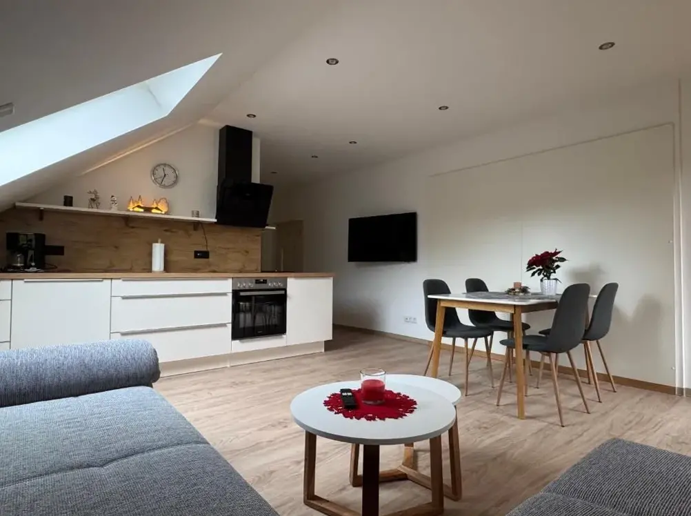Meer informatie over Villa Grün, Loft- Wohnung 09Ferienwohnung Landsbergblick in Walldorf biedt een ruim appartement met twee slaapkamers en een woonkamer, geschikt voor familieverblijf. Het appartement heeft een moderne keuken met koelkast, magnetron, vaatwasser en oven, terwijl extra faciliteiten zoals wasmachine, bureau en televisie beschikbaar zijn. Gasten kunnen gebruik maken van een tuin en terras voor buitenactiviteiten.