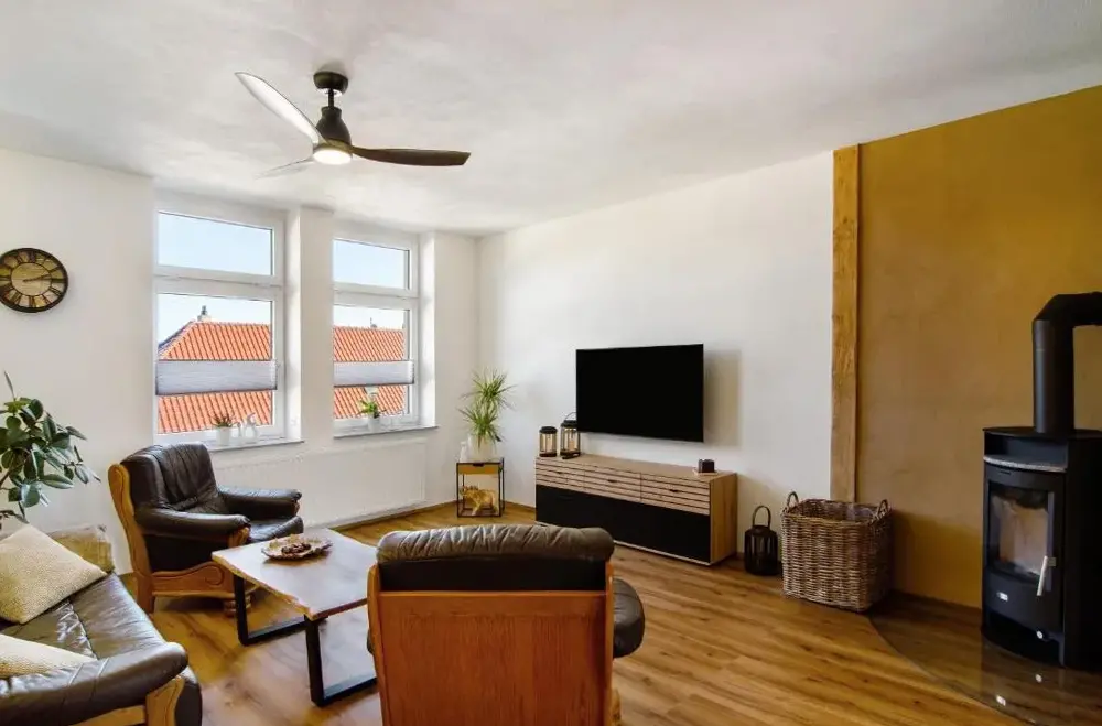 Meer informatie over Land Alm Wellness Lodge mit SaunaFerienwohnung Eichendorff in Nordhausen biedt een ruim appartement met twee slaapkamers en een eigen badkamer. Het appartement beschikt over een balkon met uitzicht op de stad, een volledig uitgeruste keuken en een gezellige open haard. Gasten kunnen gebruik maken van moderne voorzieningen zoals gratis wifi, streamingdiensten, een wasmachine en een bureau.