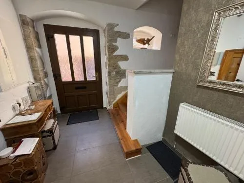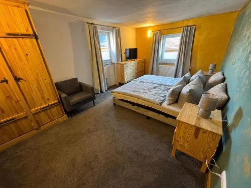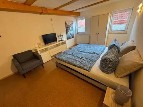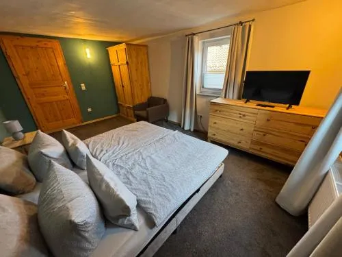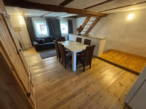 O Ferienhaus am Schlossberg em Ranis oferece uma experiência acolhedora com duas suítes e um banheiro. A residência conta com terraço, varanda e internet wireless gratuita, além de recursos modernos como máquina de lavar louça, máquina de lavar roupa e serviços de streaming. Espaços adicionais incluem roupões, área de refeições e pisos de madeira, promovendo conforto e praticidade.
